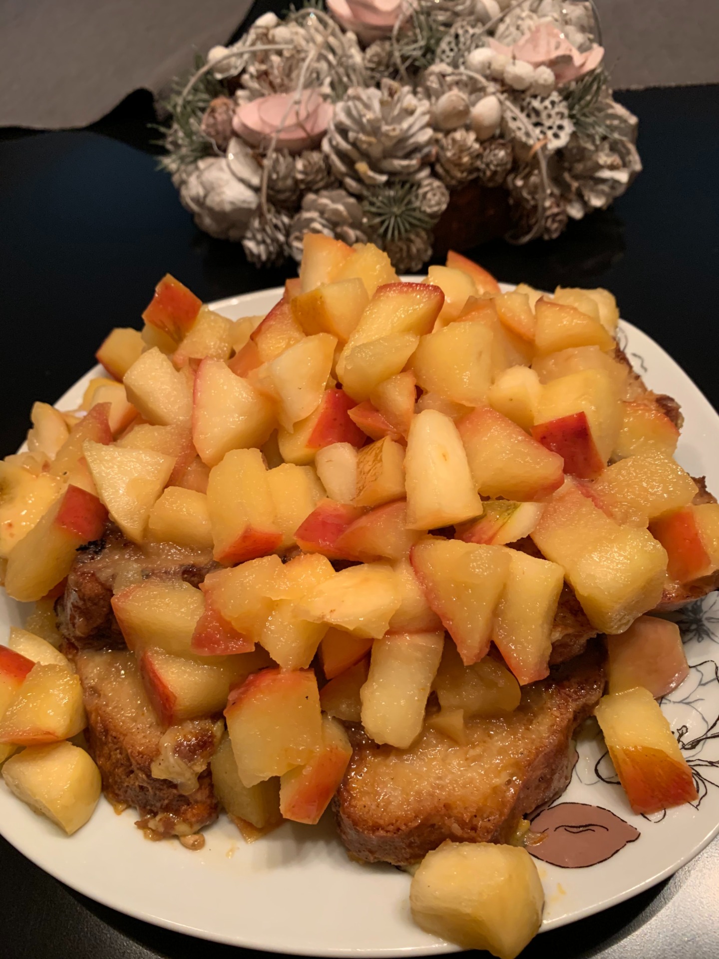 Az édesbundáskenyér jön a tányérra, ráhalmozzuk a karamelizált sült almát, és megszórjuk procukorral.