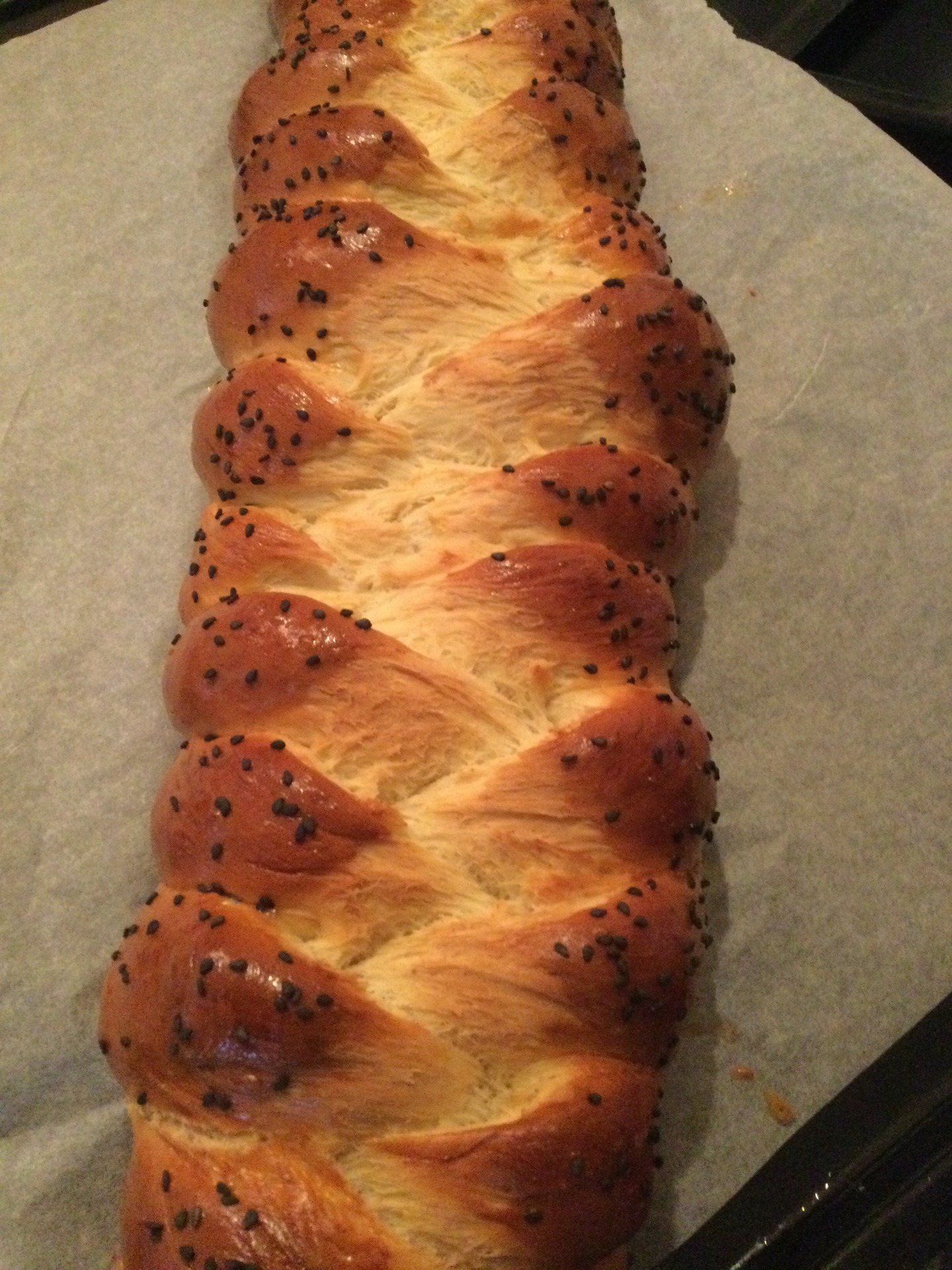 Egy dagasztógépbe tesszük a hozzávalókat. Összedagasztjuk, és 1,5 órára meleg helyre tesszük keleszteni. Ha megkelt, három egyenlő részre vágjuk, ujjnyi vastagra sodorjuk. Összefonjuk, hagyjuk még egy órát letakarva kelni. Megkenjük felvert tojással, megszórjuk szezámmaggal. 180 C fokos előmelegített sütőben 35 perc alatt készre sütjük.