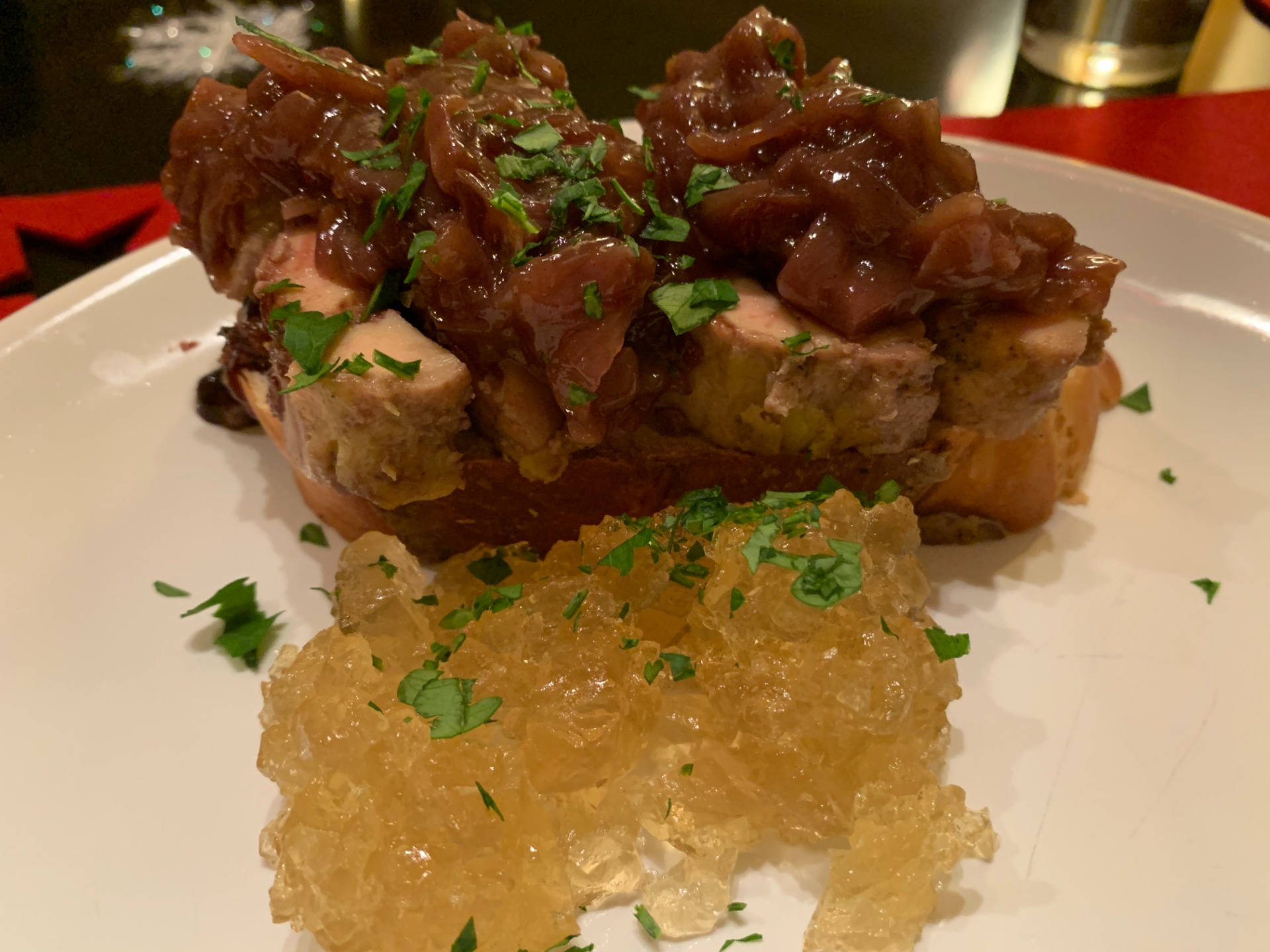 A báhreszt egy szelet vajon lepirítjuk, rátesszük a kacsamájat és a lilahagymalekvárt, majd mellé a borzselét.