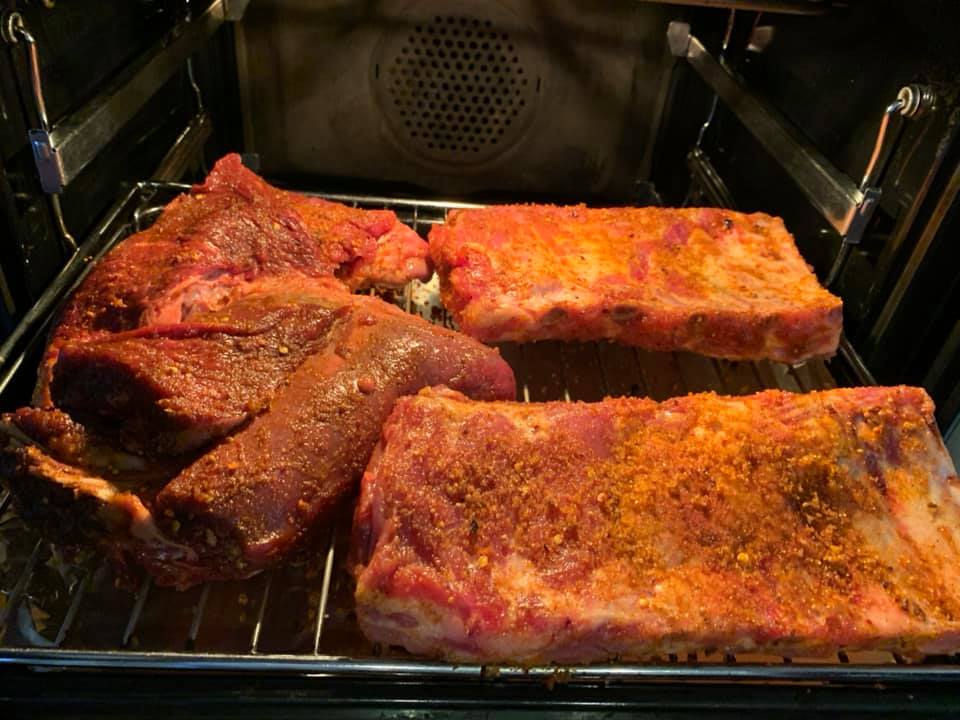 A húst légkeveréses sütőbe teszem és 115-120 °C sütöm 4 órát. A sütő indításakor egy tepsibe a sütő aljába forró vizet teszek, hogy a gőz jelen legyen sütés közben. Persze akinek gőzölős sütője van, annak ez sokkal egyszerűbben tud működni. Amikor letelt a 4 óra BBQ szósszal bekenem, és még egy órát sütöm. Ekkorra a hús puha, omlós, és a fűszerektől nagyon ízletes lesz, és természetesen szaftos marad.