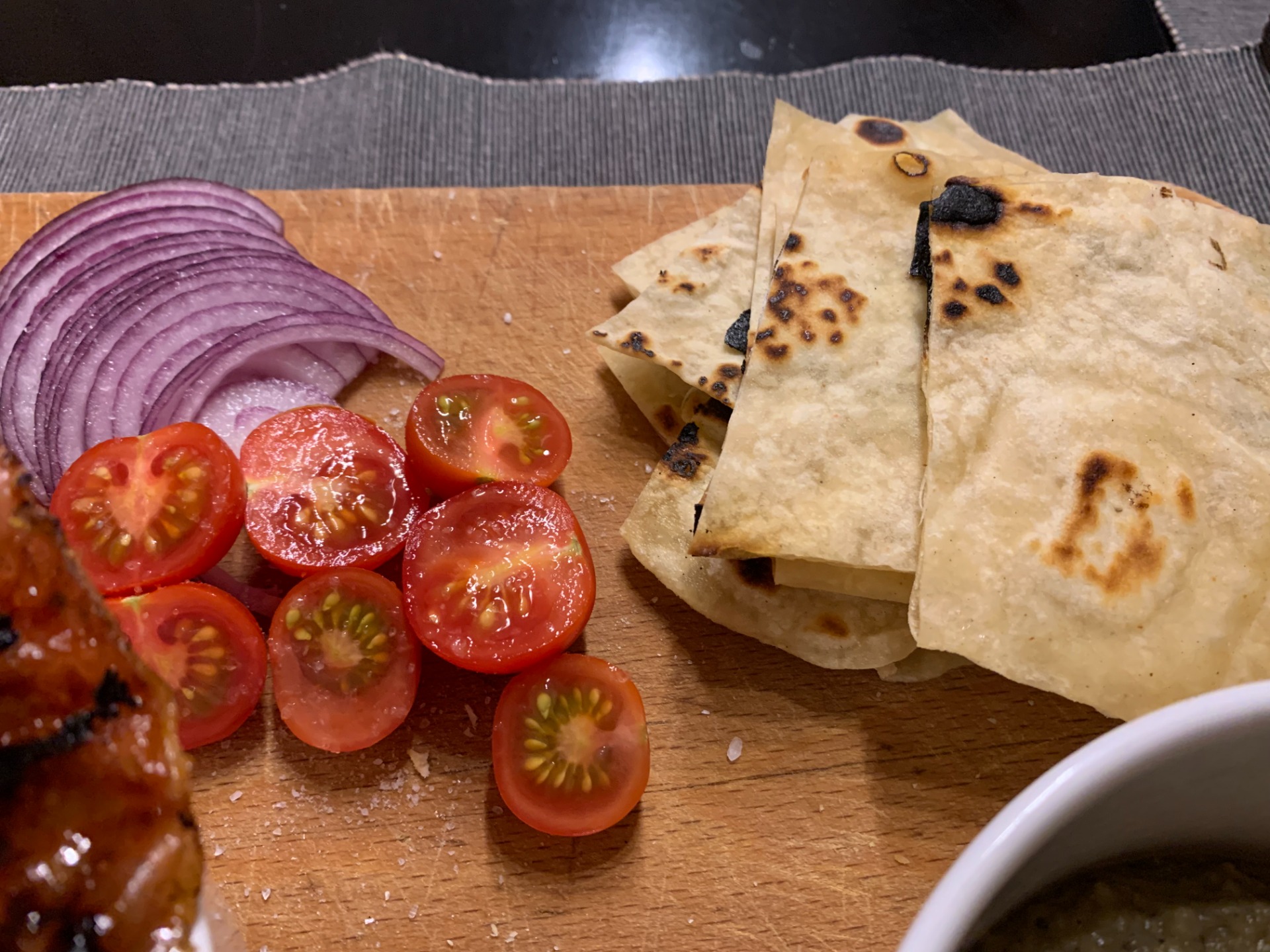 Lepénykenyér harisszával, humusszal, avokádókrémmel, és serrano sonkachipssel