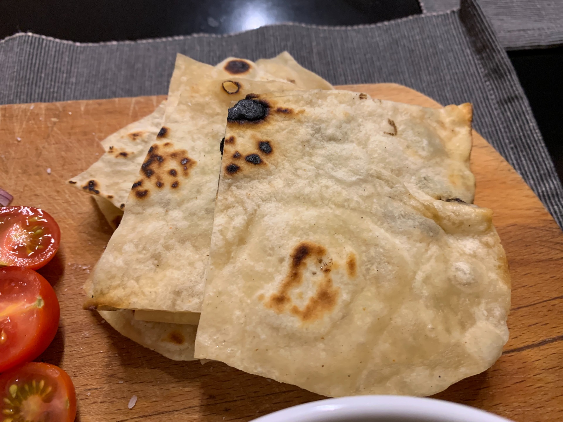 Előveszem a lepénykenyér tésztámat, és 50-60 grammos darabokra vágom, majd lisztezett deszkán vagy szilikon lapon 2-3 mm vastagra nyújtom őket. Az a lényeg, hogy minimális lisztet használjunk a nyújtáshoz. Előveszek egy palacsintasütőt, vagy szeletsütőt. Teszek bele egy csepp olajat, és kisütöm a lepénykenyereket. Kb. 10 darab lesz ebből a mennyiségből. Akkor jó az egyik oldala, amikor kezd felhólyagosodni, megfordítjuk, s a másik oldalt is készre süljük.